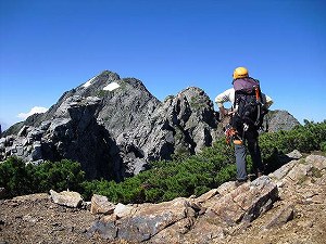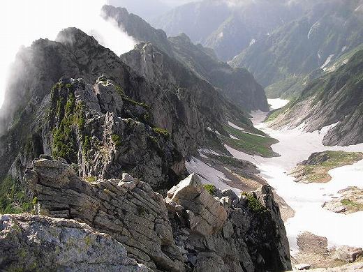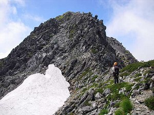 途中、雪の残るところがあり、その先の岩峰がどうやら登れそうだということで偵察に一段上の基部まで登ってみる。 すると、長次郎谷側の基部に支点をみつける。「よし」、ということで、この目の前の岩峰を登ることにした。 支点の付いている長次郎谷側を登るより、三の窓側にトラバースして階段状になった岩のルンゼを登ったほうが易しそうなので、 そちらをつめることにする。