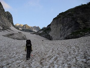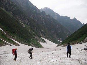 分岐でおじさんと別れ、カニの横ばいを通りながら、平蔵のコルまで下る。 雪渓の状態を見て、予定通り平蔵谷を降りることにする。 真砂沢で同じようにベースキャンプを張って毎日元気に活動していた大学生のパーティーが既に下降の準備をしていた。 上級生が大事を取ってスノーバーを打ち込んで支点を確保しているのを横目で見ながら、 出だしの急な雪渓を、パックリ口を開いたシュルントを避けながら、後ろ向きに下って行く。 すぐにガスが出てきたため、雪渓の状態を見ながら体制を整えて、前向きで下ることにする。 途中、雪渓が完全に断裂していたため、中之島のように現れたガレ場に移り、再び雪渓に降りてそのまま剣沢雪渓の出合まで下って行った。 心配だった平蔵谷の下りだったが、無事に降りられることが出来た。 早朝、真砂沢のベースキャンプを出発してから11時間弱。まだ日も高いうちに、 順調すぎるぐらいにこの縦走を終えた事に満足しながら、あと少し、真砂沢キャンプ地への道を充実感に浸って歩いた。 (この箇所K記) 8月4日 天気 晴れ 起床(3:00)〜真砂沢ロッジ(4:50)〜ハシゴ谷乗越(6:15)〜黒部川の橋(10:30)〜黒部ダム(11:15)