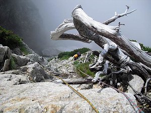 5P目 雨に降られたくない一心で最後はガツガツと上がると、そこは程よい広さの頭となっていた。 靴を履き替えて寛いでいるとガイドさんとそのお客さんが上がってきた。彼ら は渋滞を見越してなのだろう。Cフェースに上がる前にAを登られていた。無駄の無い段取りは流石だなぁ。 ちょっとガスも出てきたので急いで56のコルへと向かう。この下りは会の先 輩や派出所の方からも注意を受けた場所。三ノ窓側に行き過ぎないように気を付けなきゃ。 降り始めは三ノ窓側の踏み跡を辿り、お花畑を回り込むように行くとコルへと 繋がる懸垂ポイントに出た。灌木にこれでもかというくらいにスリングの束が あり、ハイマツからバックアップも取ってある。 最初にMDがガスの底へと消え、続いてKT。二人が降りてるので大丈夫と思いながらも、本チャンの懸垂はいつも以上に緊張する。 翌日に控えた八ツ峰上半の登り口がすぐ左手にあるのだからチェックしなけれ ばならないのに、すっかり頭から飛んでいた。 シュルントに入らないように最後の1M迄方向に気をつけて降りる。KKが降り てくるとすぐにガイドさんが追ってきた。流石にプロは手際が違う。 明日から2日間はチンネ隊と行動が別なので、ガレで互いの行動確認をする。 デポした荷物を回収しに取り付きに戻るチンネ隊と、互いの健闘を祈って握手 をして別れた。自分にはこの別れが最初の核心だったかも。。強くならねば!! テンバに戻って、小屋で明日の天気を確認するとなんと午後から雨。二人共に 初めての八ツ峰。というより剣2回目。慎重にルーファイしたいし、重荷も背 負っている。我々の実力と体力では早出をしても、有に午後にかかってしまうと思われる。 エスケープルートを過ぎてから悪天になった場合を考えると怖いなぁ。 自信がないなら明日は停滞にしよう。その代わりに明後日に荷を軽くして1日で本峰に抜けて降りてくる事にした。 8月2日 天気 晴れ 停滞