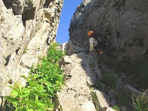 Eフェース頭からの懸垂の後、小岩峰の脇の水平道を巻き、「次も巻けそうだね。登るような踏み跡がないもんね」ということで、
