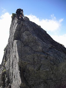 1P目 スラブのフェースを一段上がって凹角に向かってKKが取り付く。順 調にまっすぐに延びたロープは残5M程度となった所で動きが止まった。 ホールドは手足共に十分にありハーケンもベタ打ちされてるので安心。流石に ガイドさんも多い初心者の一番人気ルートって感じ。最後の10Mは階段状を上 がって先行パーティーの一段下でビレイをしているKKの元へ。チンネ隊もす ぐさま上がってきて、再び全員集合。 2P目