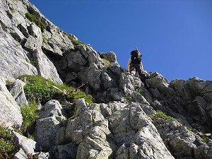 そしてルンゼを右上し、三の窓側の尾根に突き当たると、今度は長次郎谷側へ左上していくかたちだ。